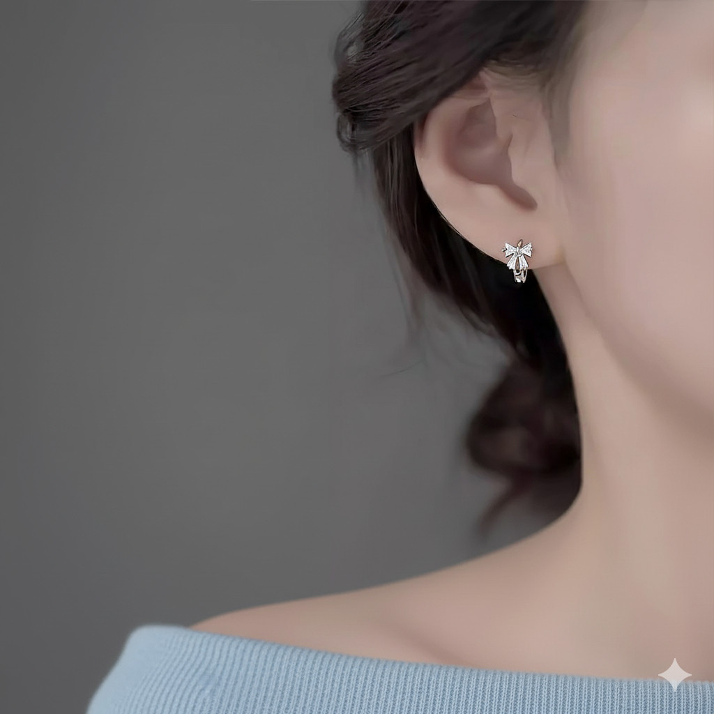 ▪️ Kiểu dáng: Bông tai vòng (hoop/huggie) ôm tai, đính nơ đá, phong cách Hàn Quốc, tiểu thư.