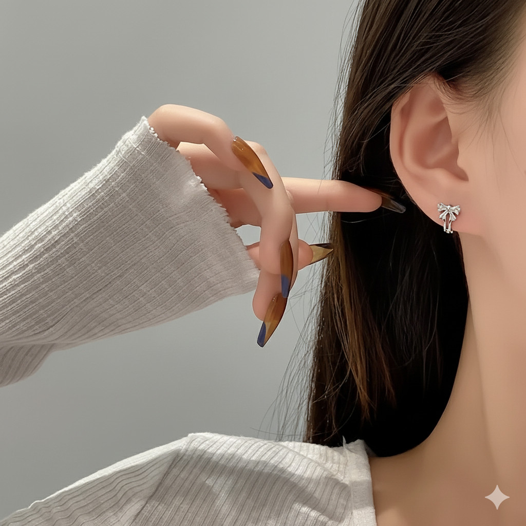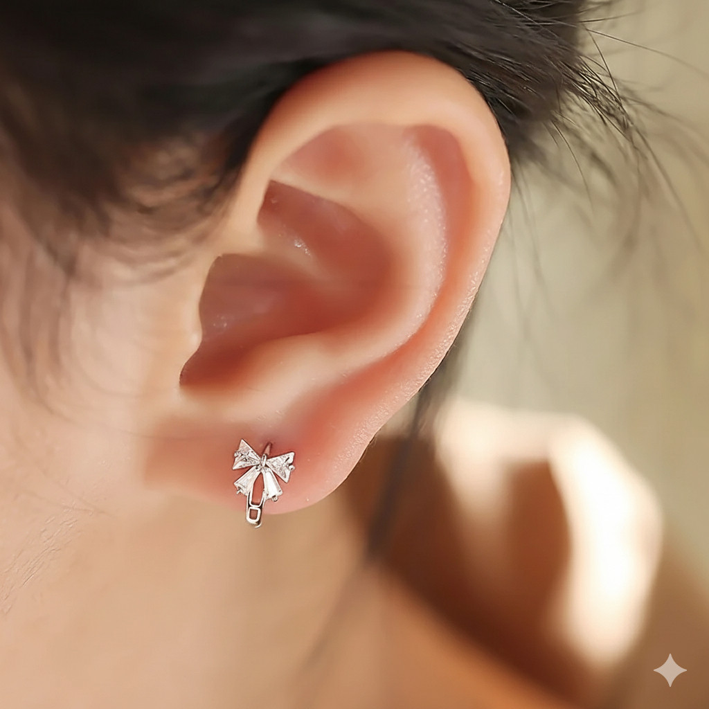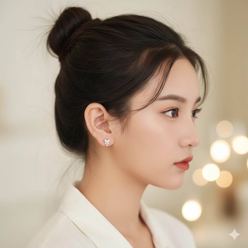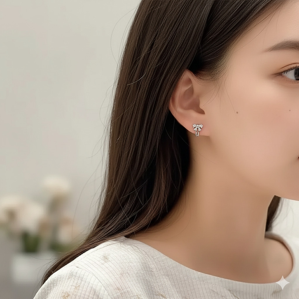✨ Đây không chỉ là một đôi bông tai vòng (hoop) thông thường. Thiết kế “huggie” ôm sát vành tai đầy hiện đại, được điểm xuyết một chiếc nơ rực rỡ, biến sự cá tính thành nét duyên dáng không ngờ.