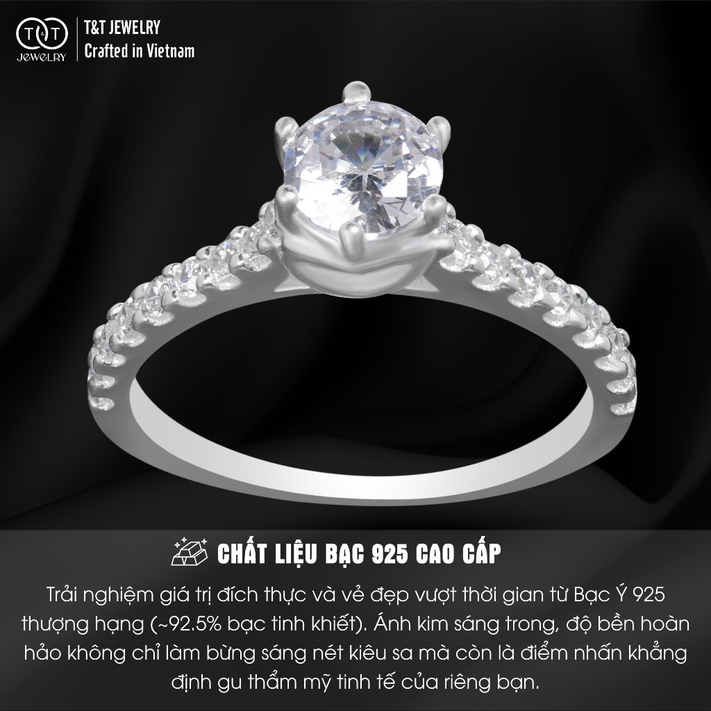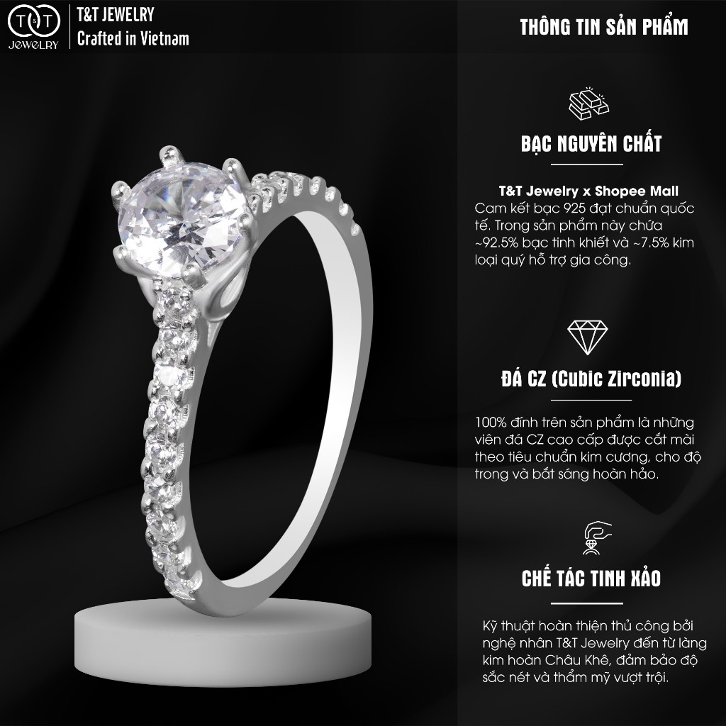 ✨ T&T JEWELRY tin rằng, vẻ đẹp kinh điển luôn có sức lay động mãnh liệt, và một chiếc nhẫn Solitaire lấp lánh chính là minh chứng hoàn hảo.💍 Gửi gắm yêu thương hay đơn giản là nuông chiều bản thân, chiếc nhẫn bạc nữ S925 này với vẻ đẹp thanh lịch vượt thời gian sẽ khiến trái tim bạn tan chảy.💎 Nổi bật là viên đá chủ CZ tròn lớn, được nâng đỡ kiêu hãnh trên bệ đỡ 6 chấu chắc chắn, tối đa hóa khả năng bắt sáng, tạo nên tâm điểm rực rỡ ✨. Vẻ đẹp ấy càng được tôn vinh bởi dải đá tấm CZ nhỏ xinh, đính kết tỉ mỉ theo kỹ thuật Pavé dọc theo hai bên vai nhẫn, tựa như một dòng suối ánh sáng lấp lánh hội tụ về viên đá chủ.💖 Sự kết hợp hài hòa giữa viên đá chủ nổi bật và đai nhẫn thanh mảnh đính đá tạo nên một tổng thể vừa sang trọng, vừa tinh tế. Đây là thành quả của kỹ nghệ chế tác bạc S925 đỉnh cao từ nghệ nhân làng kim hoàn Châu Khê 500 năm di sản của T&T.⚠️ T&T JEWELRY – An Tâm Về Chất Lượng: Hãy là người mua hàng thông thái! Chúng tôi cam kết chất lượng bạc S925 chuẩn và thiết kế độc quyền. T&T không chịu trách nhiệm về hàm lượng bạc hay độ tinh xảo của các sản phẩm nhái mẫu mã trên thị trường. Chọn T&T là chọn giá trị thật!💎 THÔNG TIN SẢN PHẨM 💎Chất liệu: Bạc S925 Ý cao cấp (92.5% bạc + hợp kim giúp tăng độ cứng, bền), 100% chế tác bởi nghệ nhân Châu Khê. Đá Cubic Zirconia (CZ) cao cấp, sáng tựa kim cương.Xuất xứ: Việt Nam – Thương hiệu T&T JEWELRY (Làng nghề Châu Khê).Bạc xỉn màu? Là dấu hiệu bạc THẬT! Do phản ứng tự nhiên với môi trường. Chỉ 5 giây với nước rửa bạc T&T độc quyền, nhẫn lại sáng bóng như mới.Ảnh sản phẩm: T&T JEWELRY tự chụp 100%. Màu sắc có thể chênh lệch rất nhẹ (dưới 5%) do ánh sáng/thiết bị xem.✨ T&T JEWELRY – QUYỀN LỢI VÀ AN TÂM ✨💯 Cam kết: Đền 10 lần nếu phát hiện bạc giả. Bảo hành làm sáng MIỄN PHÍ trọn đời. Đổi trả 7 ngày nếu lỗi sản xuất.🛠️ Hỗ trợ An Toàn & DUY NHẤT: Qua Shopee Chat. Minh bạch, đúng chính sách Shopee, bảo vệ bạn khỏi rủi ro từ kênh ngoài sàn.🎁 Quà tặng: Đi kèm hộp đựng trang sức T&T chính hãng.💡 GIỮ NHẪN LUÔN ĐẸP LẤP LÁNH 💡Tránh tiếp xúc hóa chất mạnh, mỹ phẩm trực tiếp.Nên tháo khi làm việc nặng, vận động, bơi lội.Lau nhẹ bằng khăn mềm chuyên dụng sau khi dùng.Bảo quản trong hộp/túi zip kín khi không sử dụng.Làm sáng định kỳ bằng dung dịch rửa bạc T&T.