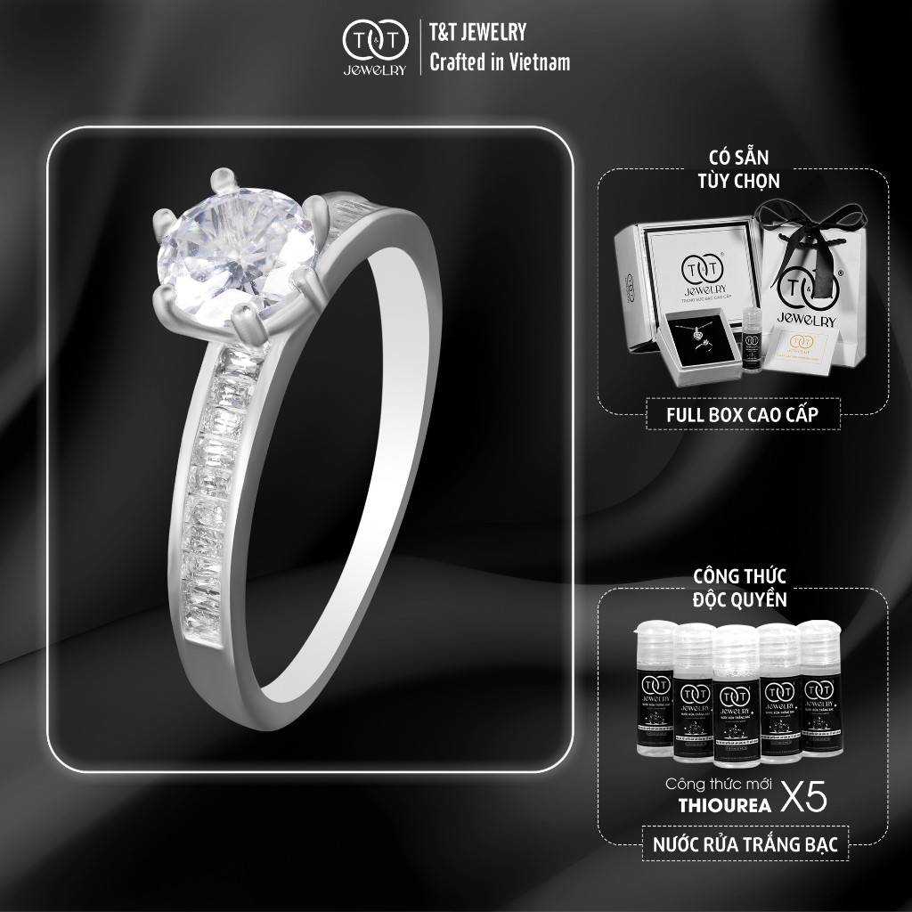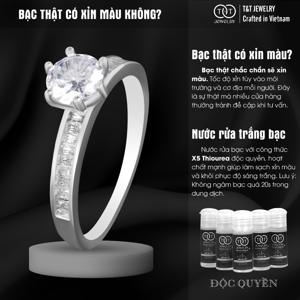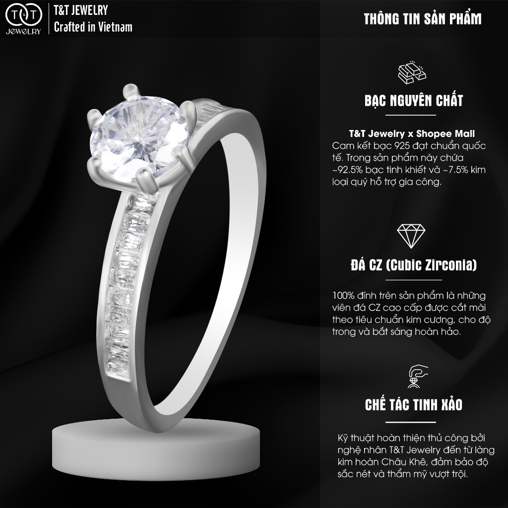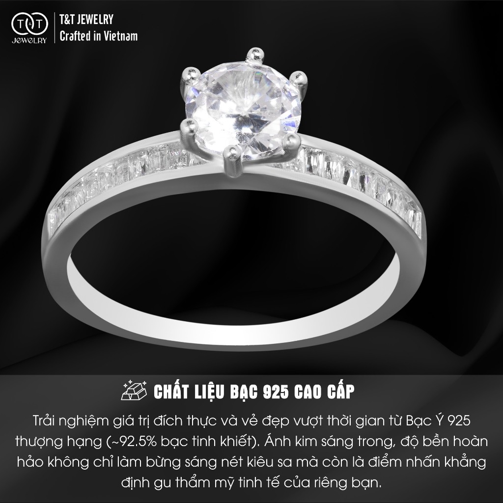💍 NHẪN BẠC NỮ T&T JEWELRY – BẢO BỐI THU HÚT MỌI ÁNH NHÌN 💍✨ Cảm giác lần đầu tiên bạn nhìn thấy một chiếc nhẫn hoàn hảo, tựa như một dải ngân hà thu nhỏ trên tay mình là như thế nào? Chiếc nhẫn bạc T&T JEWELRY này chính là “điều kì diệu” đó. Với thiết kế độc đáo, viên đá CZ lớn được nâng niu ở trung tâm, lấp lánh tựa vì sao băng, cùng hai bên đai nhẫn đính đá baguette nhỏ tinh xảo, tạo nên một bản giao hưởng ánh sáng đầy mê hoặc. Đây không chỉ là trang sức, mà là tuyên ngôn của sự sang trọng, tinh tế và một vẻ đẹp vượt thời gian.🌟 T&T Jewelry cam kết sản phẩm được chế tác hoàn toàn thủ công bởi nghệ nhân kim hoàn Châu Khê, đảm bảo từng đường nét đều tinh xảo, sắc nét. Nếu bạn tìm thấy mẫu mã tương tự trên thị trường, chúng tôi không chịu trách nhiệm về hàm lượng bạc và chất lượng chế tác.💎 THÔNG TIN SẢN PHẨM:• Chất liệu: Bạc 925 cao cấp, chứa 92.5% bạc nguyên chất theo tiêu chuẩn quốc tế. Tỷ lệ này giúp nhẫn bền, cứng và giữ form tốt hơn bạc nguyên chất 100%, nhưng vẫn giữ được độ sáng đẹp tự nhiên của bạc.• Đá chính: Viên đá CZ (Cubic Zirconia) lớn, được cắt mài tỉ mỉ, có độ lấp lánh và trong suốt không thua kém kim cương.• Đá phụ: Đá baguette được nạm dọc hai bên đai, tôn lên vẻ thanh thoát và hiện đại.• Thương hiệu: T&T JEWELRY.✨ Một chiếc nhẫn hoàn hảo để bạn diện đi tiệc, đi chơi hay đơn giản là tỏa sáng mỗi ngày. Kết hợp cùng những bộ trang phục yêu thích, chiếc nhẫn này sẽ trở thành điểm nhấn không thể thiếu, giúp bạn tự tin thể hiện cá tính riêng.🎁 Sản phẩm được tặng kèm hộp đựng sang trọng, là món quà ý nghĩa cho bản thân hoặc người thương yêu.Từ khóa: nhẫn bạc, nhẫn bạc nữ, nhẫn bạc s925, nhẫn đính đá, nhẫn bạc T&T Jewelry, nhẫn bạc đẹp, nhẫn bạc cao cấp, nhẫn bạc nữ đính đá, nhẫn nữ, trang sức bạc.Hashtag: #nhanbac #nhanbacnu #nhanbacS925 #nhandinhda #nhanbacTTJewelry #nhanbacdep #nhanbaccaocap #nhanbacnudinhda #nhannu #trangsucbac