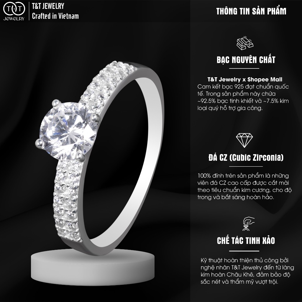 💍 T&T JEWELRY thấu hiểu, mỗi cô gái đều xứng đáng tỏa sáng theo cách riêng. Chiếc nhẫn bạc nữ S925 này không chỉ là trang sức, mà là lời khẳng định cho vẻ đẹp tinh tế và gu thẩm mỹ độc đáo của bạn. ✨🌟 Ngay từ cái nhìn đầu tiên, bạn sẽ bị cuốn hút bởi viên đá chủ CZ tròn trịa, được cắt giác tỉ mỉ, bắt sáng diệu kỳ như một vì sao trên bầu trời đêm. Viên đá được nâng niu bởi 4 chấu chắc chắn, tối giản mà thanh lịch.💎 Điểm nhấn độc đáo nằm ở phần đai nhẫn: một dải đá tấm CZ nhỏ xinh được đính kết cẩn thận dọc theo hai bên vai nhẫn, tạo hiệu ứng lấp lánh liền mạch, tựa như dải ngân hà thu nhỏ ôm lấy ngón tay thanh mảnh. Thiết kế vừa tôn lên viên đá chủ rực rỡ, vừa mang lại nét sang trọng, kiêu sa khó cưỡng.💖 Đeo chiếc nhẫn này, bạn sẽ cảm nhận sự tự tin lan tỏa, thu hút mọi ánh nhìn dù ở bất cứ đâu. Đây là món quà hoàn hảo để tự thưởng cho bản thân hay gửi trao yêu thương đến người phụ nữ đặc biệt.⚜️ Chất lượng độc quyền từ T&T JEWELRY: Mỗi chiếc nhẫn là tâm huyết của nghệ nhân làng kim hoàn Châu Khê 500 năm tuổi, chế tác riêng cho T&T. Lưu ý: Các sản phẩm có thiết kế tương tự trên thị trường không thuộc T&T JEWELRY có thể không đảm bảo hàm lượng bạc S925 chuẩn và độ tinh xảo trong chế tác.📜 Thông Tin Sản Phẩm:Chất liệu: Bạc S925 cao cấp (92.5% bạc nguyên chất, 7.5% hợp kim khác). Tại sao lại là S925? Bạc nguyên chất (99.9%) rất mềm, dễ méo. S925 là tiêu chuẩn quốc tế cho trang sức bạc, đủ độ cứng để giữ form tinh xảo và độ bền cao, mà vẫn giữ được màu trắng sáng đặc trưng của bạc. ✨Đá: Đá Cubic Zirconia (CZ) cao cấp, trong suốt, giác cắt hoàn hảo cho độ lấp lánh tối đa.Chế tác: 100% thủ công bởi nghệ nhân kim hoàn Châu Khê cho T&T JEWELRY.Màu sắc: Trắng sáng bóng, tôn da. (Lưu ý: Hình ảnh do T&T tự chụp, màu sắc thực tế có thể chênh lệch ±5% do điều kiện ánh sáng và màn hình hiển thị).✨ T&T JEWELRY – BẢO HÀNH & HỖ TRỢ KHÁCH HÀNG ✨💖 Cảm ơn bạn đã chọn T&T Jewelry!Chúng tôi hiểu những băn khoăn khi mua trang sức online:1️⃣ “Sản phẩm có giống ảnh không?”2️⃣ “Có phải bạc thật S925 không?”3️⃣ “Nếu có vấn đề thì sao?”💯 T&T Jewelry x Shopee Mall cam kết:1️⃣ Hoàn tiền 100% trong 7 ngày nếu sai mô tả/lỗi sản xuất.2️⃣ Đền gấp 10 lần nếu phát hiện bạc giả (T&T chịu trách nhiệm pháp lý).3️⃣ Bảo hành trọn đời lỗi kỹ thuật.⛔ Hỗ trợ DUY NHẤT qua Shopee Chat: An toàn, minh bạch, đúng quy định Shopee. Chúng tôi KHÔNG hỗ trợ qua các kênh ngoại sàn để bảo vệ bạn khỏi rủi ro. Gặp vấn đề? Chat ngay với T&T!🌟 HƯỚNG DẪN SỬ DỤNG ĐỂ TRANG SỨC BẠC LUÔN SÁNG BÓNG 🌟1️⃣ Lau nhẹ sau khi đeo bằng khăn mềm.2️⃣ Hạn chế tiếp xúc hóa chất (nước hoa, mỹ phẩm…).3️⃣ Cất vào hộp/túi zip khi không dùng.4️⃣ Làm sạch định kỳ bằng nước rửa bạc T&T khi thấy xỉn.5️⃣ Tháo ra khi vận động mạnh, tiếp xúc clo hồ bơi.💖 Bạn Hài Lòng – T&T Hạnh Phúc: Đánh giá 5 ⭐ là động lực lớn nhất cho chúng tôi!