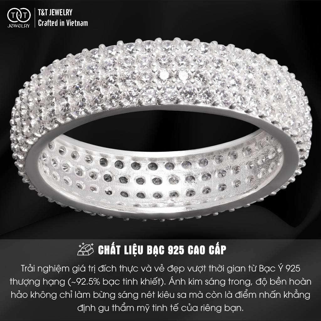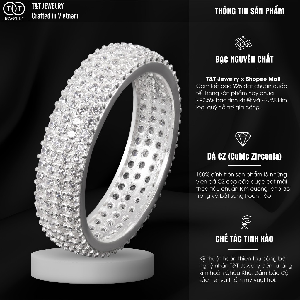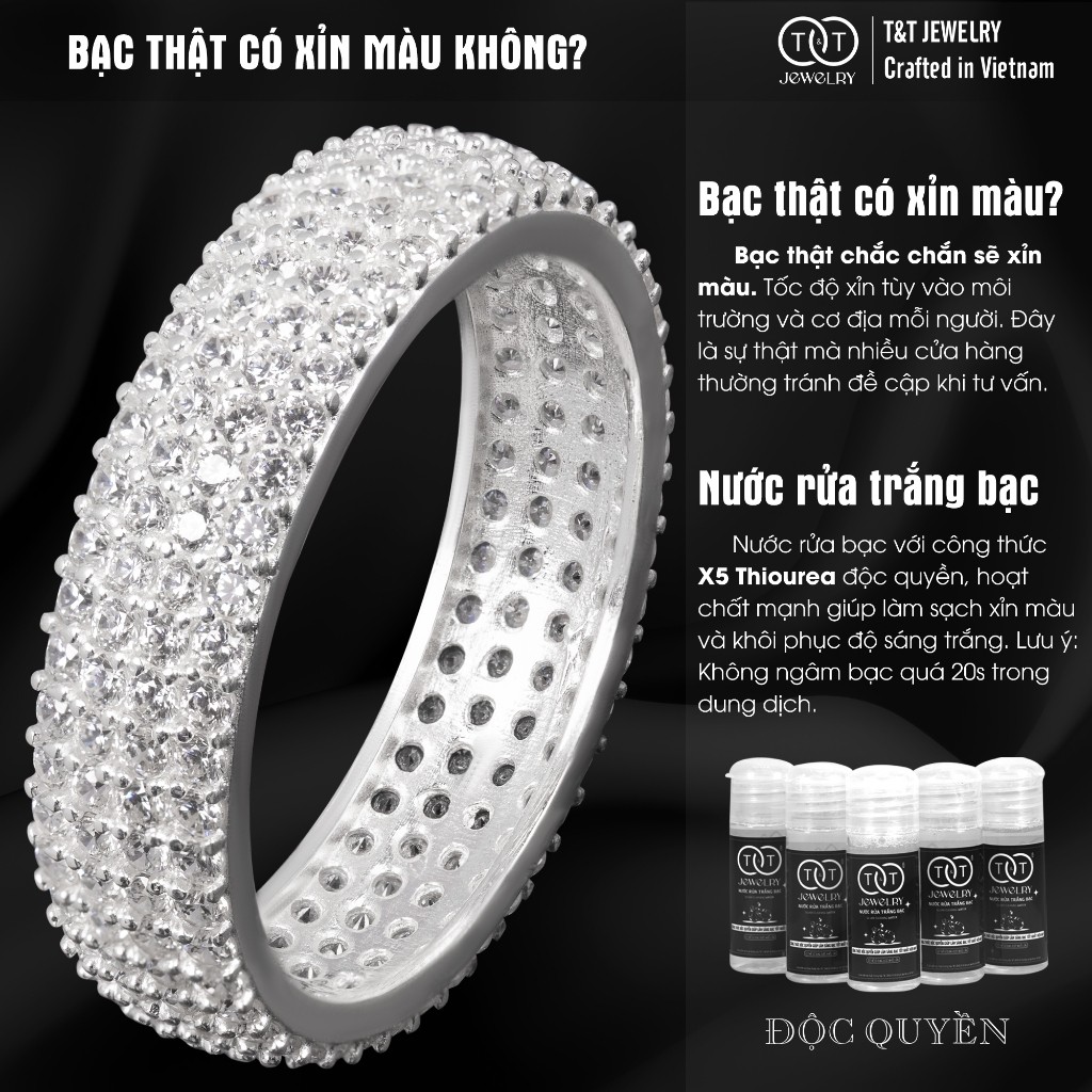 💍 Nàng đang tìm kiếm một điểm nhấn không chỉ lấp lánh, mà còn kể một câu chuyện riêng?Hãy tưởng tượng hàng trăm vì tinh tú hội tụ trên đôi tay nàng, gói trọn trong một thiết kế Vành Đai Vô Cực tinh xảo. Đó chính là kiệt tác mà T&T JEWELRY mang đến. Mỗi viên đá CZ cao cấp được đính kết tỉ mỉ, san sát nhau, tạo nên một dải ngân hà lấp lánh không điểm dừng. ✨Mỗi cử động, mỗi tia sáng lướt qua, chiếc nhẫn bừng lên một vũ điệu ánh sáng kỳ diệu, biến đôi tay nàng thành tâm điểm của mọi ánh nhìn. Đây không chỉ là trang sức, đây là lời khẳng định cho vẻ đẹp kiêu sa và khí chất riêng của nàng.Được chế tác độc quyền bởi nghệ nhân kim hoàn làng nghề Châu Khê 500 năm tuổi, mỗi chiếc nhẫn là một tuyệt tác thủ công mang trọn vẹn tâm huyết và kỹ thuật bậc thầy.💖 Lưu ý đặc biệt từ T&T: Vẻ đẹp này là độc nhất. Các sản phẩm có thiết kế tương tự trên thị trường không thuộc T&T JEWELRY sẽ không thể đảm bảo chất lượng bạc S925 tinh khiết và độ tinh xảo trong từng đường nét. Hãy là người tiêu dùng thông thái để nhận được giá trị xứng đáng nhất nàng nhé!Nếu có bất kỳ băn khoăn nào, đừng ngần ngại nhắn tin cho shop để được tư vấn tận tình nhất!THÔNG TIN SẢN PHẨM💎 Chất Liệu: Bạc S925 cao cấp (chuẩn quốc tế với 92.5% bạc nguyên chất, 7.5% hợp kim giúp tăng độ cứng, độ bền và giữ độ sáng bóng cho trang sức).💎 Đá: Đá CZ (Cubic Zirconia) cao cấp, được cắt mài giác cẩn thận cho hiệu ứng lấp lánh như kim cương.💎 Nguồn Gốc: Chế tác 100% bởi nghệ nhân làng nghề kim hoàn Châu Khê, độc quyền cho T&T JEWELRY.📸 Lưu ý về hình ảnh: Ảnh do T&T JEWELRY tự chụp sản phẩm thật. Tuy nhiên, do điều kiện ánh sáng và màn hình hiển thị khác nhau, màu sắc thực tế có thể chênh lệch một chút (không đáng kể).⚠️ Tại sao bạc S925 bị xỉn màu?Đây là ĐẶC TÍNH TỰ NHIÊN của bạc thật khi tiếp xúc với lưu huỳnh trong không khí & mồ hôi, là dấu hiệu nhận biết bạc chuẩn, không phải lỗi sản phẩm.=> Đừng lo lắng! Chỉ cần 5 giây với dung dịch rửa bạc độc quyền của T&T, chiếc nhẫn sẽ sáng bóng trở lại như mới.✨ T&T JEWELRY – BẢO HÀNH & HỖ TRỢ KHÁCH HÀNG ✨💖 Cảm ơn bạn đã chọn T&T Jewelry!Trang sức không chỉ là một món phụ kiện, mà còn là cách bạn thể hiện phong cách và cá tính. Khi mua trang sức online, chúng tôi hiểu rằng bạn có thể có những băn khoăn như:1️⃣ “Liệu sản phẩm có giống ảnh không?”2️⃣ “Có phải bạc thật không?”3️⃣ “Nếu có vấn đề thì làm sao?”💯 T&T Jewelry x Shopee Mall cam kết mang đến bạc 925 cao cấp cùng sự hỗ trợ tận tâm, giúp bạn hoàn toàn yên tâm khi mua sắm:1️⃣ Hoàn tiền nhanh chóng trong 7 ngày nếu sản phẩm không đúng mô tả hoặc có lỗi từ nhà sản xuất.2️⃣ T&T cam kết đền gấp 10 lần giá trị nếu sản phẩm khách hàng nhận được là bạc giả – và chúng tôi chịu hoàn toàn trách nhiệm trước pháp luật Việt Nam.3️⃣ Bảo hành trọn đời với lỗi kỹ thuật do nhà sản xuất – chỉ cần nhắn Shopee Chat, chúng tôi sẽ hỗ trợ ngay!⛔ Hỗ trợ nhanh chóng và duy nhất qua Shopee Chat – đảm bảo giao dịch an toàn, MINH BẠCH, tuân thủ quy định của Shopee và giúp bạn tránh mọi rủi ro từ các kênh không chính thống. Không hỗ trợ qua các kênh liên lạc ngoại sàn để bảo vệ quyền lợi của bạn. Nếu có bất kỳ vấn đề gì, đừng lo lắng! Nhắn ngay cho chúng tôi qua Shopee Chat, đội ngũ T&T Jewelry sẽ hỗ trợ tận tình!❓ SỰ THẬT VỀ BẠC 925 – HIỂU ĐỂ AN TÂM1️⃣ Trang sức của T&T Jewelry có phải bạc thật không?✔ Cam kết 100% bạc 925 cao cấp, chứa 92,5% bạc nguyên chất, đạt tiêu chuẩn quốc tế.📌 Tại sao không phải bạc nguyên chất 100%?Bạc nguyên chất quá mềm, dễ bị móp méo, vì vậy cần pha một lượng nhỏ hợp kim giúp trang sức bền hơn, cứng hơn, giữ form tốt hơn. Đây là tiêu chuẩn chung của ngành kim hoàn.2️⃣ Tại sao bạc bị xỉn màu? Có phải hàng kém chất lượng không?🌟 Hoàn toàn không! Đây chính là dấu hiệu của bạc thật! 🌟🔬 Nguyên nhân bạc bị xỉn:Bạc phản ứng với lưu huỳnh trong không khí, nước hoa, mồ hôi, hóa mỹ phẩm…Tùy môi trường tiếp xúc, bạc có thể xỉn nhanh hay chậm, nhưng đây là tính chất tự nhiên của bạc chứ không phải lỗi sản phẩm.💡 Giải pháp cực đơn giản:✔ Dùng nước rửa bạc chuyên dụng – chỉ vài giây là sáng trắng như mới!🌟 HƯỚNG DẪN SỬ DỤNG ĐỂ TRANG SỨC BẠC LUÔN SÁNG BÓNG✨ Trang sức bạc đẹp nhất khi được yêu thương và chăm sóc đúng cách!1️⃣ Lau chùi nhẹ nhàng sau mỗi lần đeo.2️⃣ Hạn chế tiếp xúc hóa chất: nước hoa, mỹ phẩm, chất tẩy rửa.3️⃣ Cất giữ cẩn thận trong hộp kín hoặc túi zip khi không dùng.4️⃣ Làm sạch định kỳ bằng dung dịch rửa bạc độc quyền của T&T khi thấy bạc xỉn màu.5️⃣ Tháo trang sức khi vận động mạnh hoặc đi bơi.💖 Bạn Hài Lòng – T&T Hạnh Phúc: Một đánh giá 5 sao sẽ