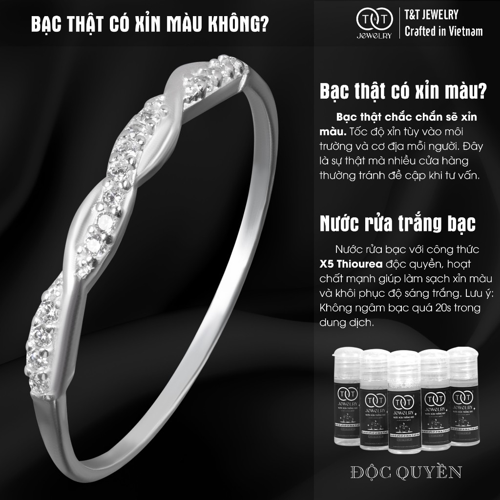 T&T thấu hiểu rằng, mỗi cô gái đều xứng đáng sở hữu một món trang sức không chỉ đẹp, mà còn chứa đựng một câu chuyện riêng. 💖Chiếc nhẫn bạc này không chỉ là phụ kiện, mà là một tác phẩm nghệ thuật trên đôi tay bạn. Thiết kế xoắn kép độc đáo, tựa như hai dải lụa mềm mại, thanh lịch quấn quýt lấy nhau.✨ Một dải bạc S925 trơn bóng, tượng trưng cho vẻ đẹp thuần khiết.💎 Một dải được đính đá CZ cao cấp lấp lánh, đại diện cho nét kiêu sa và rạng rỡ.Sự đan xen hài hòa này tạo nên một tổng thể vừa dịu dàng, nữ tính lại vừa nổi bật, thu hút mọi ánh nhìn. Đeo trên tay, chiếc nhẫn tôn lên những ngón tay thon dài và làn da trắng sáng của bạn.Được chế tác độc quyền bởi nghệ nhân làng kim hoàn Châu Khê với 500 năm lịch sử cho T&T JEWELRY, mỗi đường nét đều thể hiện sự tỉ mỉ và tâm huyết.⚠️ Cảnh Báo Từ T&T JEWELRY: Nhiều mẫu mã trên thị trường có thể sao chép kiểu dáng của chúng tôi. Tuy nhiên, T&T không thể đảm bảo về chất lượng gia công, độ tinh xảo và hàm lượng bạc chuẩn của những sản phẩm không do chúng tôi phân phối. Hãy là người tiêu dùng thông thái để nhận được giá trị xứng đáng nhất! 😉💍 THÔNG TIN SẢN PHẨM▪️ Chất liệu: Bạc Ý S925 cao cấp (chứa 92.5% bạc nguyên chất, phần còn lại là hợp kim giúp tăng độ cứng, độ bền và giữ độ sáng bóng cho trang sức). Cam kết 100% chuẩn hàm lượng bạc.▪️ Đá đính kèm: Đá CZ (Cubic Zirconia) cao cấp, được cắt mài tinh xảo tạo hiệu ứng lấp lánh tựa kim cương.▪️ Chế tác: 100% bởi nghệ nhân kim hoàn làng nghề Châu Khê theo thiết kế độc quyền của T&T JEWELRY.▪️ Lưu ý màu sắc: Hình ảnh do T&T JEWELRY tự chụp để đảm bảo tính chân thực. Tuy nhiên, màu sắc có thể chênh lệch không đáng kể (dưới 5%) do điều kiện ánh sáng và màn hình hiển thị của mỗi thiết bị.✨ T&T JEWELRY – BẢO HÀNH & HỖ TRỢ KHÁCH HÀNG ✨💖 Cảm ơn bạn đã chọn T&T Jewelry!Trang sức không chỉ là một món phụ kiện, mà còn là cách bạn thể hiện phong cách và cá tính. Khi mua trang sức online, chúng tôi hiểu rằng bạn có thể có những băn khoăn như:1️⃣ “Liệu sản phẩm có giống ảnh không?”2️⃣ “Có phải bạc thật không?”3️⃣ “Nếu có vấn đề thì làm sao?”💯 T&T Jewelry x Shopee Mall cam kết mang đến bạc 925 cao cấp cùng sự hỗ trợ tận tâm, giúp bạn hoàn toàn yên tâm khi mua sắm:1️⃣ Hoàn tiền nhanh chóng trong 7 ngày nếu sản phẩm không đúng mô tả hoặc có lỗi từ nhà sản xuất.2️⃣ T&T cam kết đền gấp 10 lần giá trị nếu sản phẩm khách hàng nhận được là bạc giả – và chúng tôi chịu hoàn toàn trách nhiệm trước pháp luật Việt Nam.3️⃣ Bảo hành trọn đời với lỗi kỹ thuật do nhà sản xuất – chỉ cần nhắn Shopee Chat, chúng tôi sẽ hỗ trợ ngay!⛔ Hỗ trợ nhanh chóng và duy nhất qua Shopee Chat – đảm bảo giao dịch an toàn, MINH BẠCH, tuân thủ quy định của Shopee và giúp bạn tránh mọi rủi ro từ các kênh liên lạc ngoại sàn. Không hỗ trợ qua các nền tảng khác để bảo vệ quyền lợi của bạn. Nếu có bất kỳ vấn đề gì, đừng lo lắng! Nhắn ngay cho chúng tôi qua Shopee Chat, đội ngũ T&T Jewelry sẽ hỗ trợ tận tình!❓ SỰ THẬT VỀ BẠC 925 – HIỂU ĐỂ AN TÂM1️⃣ Trang sức của T&T Jewelry có phải bạc thật không?✔ Cam kết 100% bạc 925 cao cấp, chứa 92,5% bạc nguyên chất, đạt tiêu chuẩn quốc tế.📌 Tại sao không phải bạc nguyên chất 100%?Bạc nguyên chất quá mềm, dễ bị móp méo, vì vậy cần pha một lượng nhỏ hợp kim giúp trang sức bền hơn, cứng hơn, giữ form tốt hơn. Đây là tiêu chuẩn chung của ngành kim hoàn.2️⃣ Tại sao bạc bị xỉn màu? Có phải hàng kém chất lượng không?🌟 Hoàn toàn không! Đây chính là dấu hiệu của bạc thật! 🌟🔬 Nguyên nhân bạc bị xỉn:Bạc phản ứng với lưu huỳnh trong không khí, mồ hôi, hóa mỹ phẩm… Một số người có cơ địa mồ hôi muối, bạc có thể xỉn nhanh hơn – điều này không liên quan đến chất lượng bạc mà là tính chất hóa học tự nhiên.💡 Giải pháp cực đơn giản:✔ Dùng nước rửa bạc công thức độc quyền của T&T – chỉ 5 giây là sáng trắng như mới!✔ Bảo quản đúng cách để giữ trang sức luôn đẹp (xem hướng dẫn bên dưới).🌟 HƯỚNG DẪN SỬ DỤNG ĐỂ TRANG SỨC BẠC LUÔN SÁNG BÓNG✨ Trang sức bạc đẹp nhất khi được yêu thương và chăm sóc đúng cách!1️⃣ Lau chùi nhẹ nhàng: Sau mỗi lần đeo, hãy dùng khăn mềm lau sạch mồ hôi, bụi bẩn.2️⃣ Hạn chế tiếp xúc hóa chất: Đeo trang sức sau cùng, sau khi đã trang điểm và xịt nước hoa.3️⃣ Cất giữ cẩn thận: Bảo quản trong túi zip hoặc hộp kín khi không sử dụng.4️⃣ Làm sạch định kỳ: Sử dụng nước rửa bạc chuyên dụng của T&T ngay khi thấy bạc có dấu hiệu xỉn màu để trang sức trắng sáng trở lại.5️⃣ Tháo trang sức khi cần: Nên tháo khi đi bơi, tập thể thao hoặc làm việc nặng để tránh va đập.💖 Bạn Hài Lòng – T&T Hạnh Phúc: Một đánh giá 5 sao sẽ 