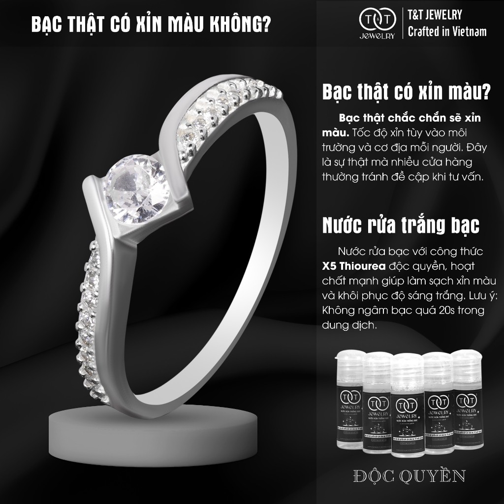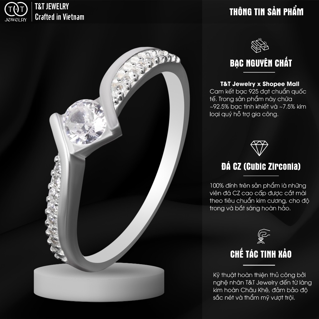 ✨ T&T JEWELRY hiểu rằng, bạn không chỉ tìm kiếm trang sức, mà còn tìm kiếm một tuyên ngôn cá tính, một thiết kế phá cách đầy cuốn hút.💍 Dành cho cô nàng yêu vẻ đẹp hiện đại và không ngại khác biệt, chiếc nhẫn bạc nữ S925 kiểu Bypass này là mảnh ghép hoàn hảo cho phong cách của bạn.💎 Thiết kế gây ấn tượng mạnh mẽ với viên đá chủ CZ tròn lấp lánh, được ôm trọn đầy nghệ thuật bởi cấu trúc đai lệch (Bypass) độc đáo. Hai dải bạc tựa như đang uyển chuyển lướt qua nhau, một dải tạo thành bệ đỡ vững chắc cho viên đá chủ, cả hai đều được tô điểm thêm hàng đá tấm CZ ✨ đính tinh xảo theo kỹ thuật Pavé, tăng thêm sự lấp lánh và chiều sâu cho tổng thể.💖 Sự kết hợp giữa đường nét mạnh mẽ, bất đối xứng của kiểu Bypass và vẻ rực rỡ của đá CZ trên nền bạc S925 cao cấp tạo nên một sức hút khó cưỡng. Đây là tác phẩm của nghệ nhân Châu Khê 500 năm kinh nghiệm, đảm bảo độ tinh xảo và chất lượng vượt trội.⚠️ T&T JEWELRY – Chất Lượng Tạo Nên Sự Khác Biệt: Hãy là người tiêu dùng thông thái! Cam kết bạc S925 chuẩn quốc tế và thiết kế độc quyền. T&T không chịu trách nhiệm về chất lượng bạc hay độ tinh xảo của các sản phẩm nhái mẫu mã. Chọn T&T để sở hữu giá trị thật sự!💎 THÔNG TIN SẢN PHẨM 💎Chất liệu: Bạc S925 Ý cao cấp (92.5% bạc + hợp kim tăng độ cứng, bền, giữ form), chế tác 100% bởi nghệ nhân Châu Khê. Đá Cubic Zirconia (CZ) cao cấp.Xuất xứ: Việt Nam – Thương hiệu T&T JEWELRY (Làng nghề Châu Khê).Bạc xỉn màu? Đó là dấu hiệu bạc THẬT, phản ứng tự nhiên với môi trường. Chỉ 5 giây với nước rửa bạc độc quyền T&T, nhẫn sáng bóng trở lại như mới.Ảnh sản phẩm: Chụp thật 100% bởi T&T JEWELRY. Màu sắc có thể chênh lệch rất nhẹ (dưới 5%) do ánh sáng/thiết bị xem.✨ T&T JEWELRY – AN TÂM MUA SẮM ONLINE ✨💯 Cam kết: Đền 10 lần nếu phát hiện bạc giả. Bảo hành làm sáng MIỄN PHÍ trọn đời. Đổi trả 7 ngày nếu lỗi sản xuất.🛠️ Hỗ trợ An Toàn & DUY NHẤT: Qua Shopee Chat. Minh bạch, đúng chính sách Shopee, bảo vệ bạn khỏi rủi ro lừa đảo từ kênh ngoài.🎁 Quà tặng: Đi kèm hộp đựng trang sức T&T chính hãng.💡 GIỮ NHẪN LUÔN TỎA SÁNG 💡Tránh tiếp xúc hóa chất, mỹ phẩm mạnh.Nên tháo khi làm việc nặng, vận động, bơi lội.Lau nhẹ bằng khăn mềm sau khi sử dụng.Bảo quản trong hộp/túi zip kín khi không đeo.Làm sáng định kỳ bằng dung dịch rửa bạc T&T.