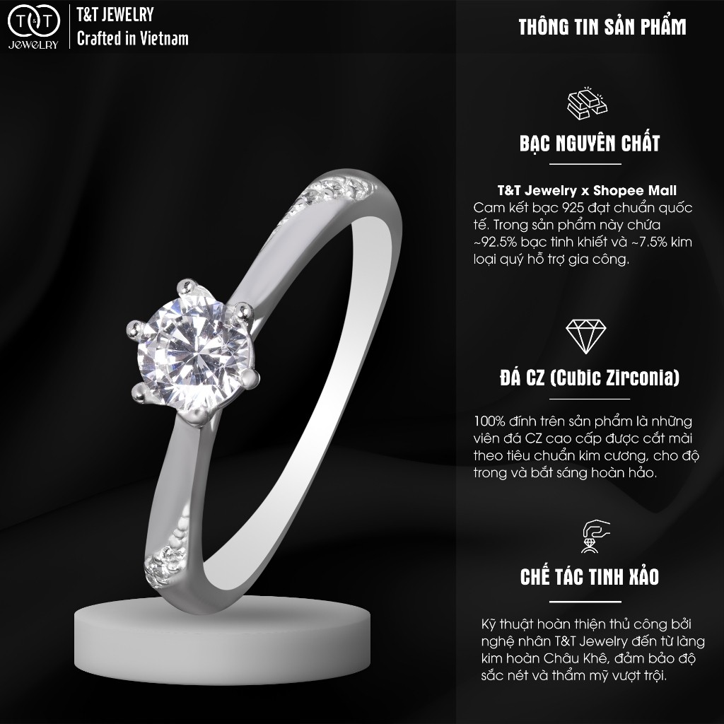 ✨ T&T JEWELRY hiểu rằng, vẻ đẹp đích thực đôi khi nằm ở sự tinh tế, một nét chấm phá duyên dáng trên nền thiết kế kinh điển, đủ để tạo nên sự khác biệt đầy cuốn hút.💍 Chiếc nhẫn bạc nữ S925 này là lựa chọn hoàn hảo cho quý cô yêu thích vẻ đẹp thanh lịch của nhẫn Solitaire nhưng vẫn muốn một chút nhấn nhá mềm mại, lấp lánh trên đai nhẫn.💎 Viên đá chủ CZ tròn lớn, cắt giác brilliant rực rỡ, được nâng đỡ trang trọng và chắc chắn bởi 6 chấu. Vẻ đẹp kinh điển được tô điểm thêm nét duyên dáng nhờ thiết kế đai nhẫn xoắn nhẹ ✨ ở hai bên vai: một dải bạc trơn bóng mềm mại uốn lượn, đan xen cùng một dải bạc được đính đá tấm CZ nhỏ xinh theo kỹ thuật Pavé, tạo nên hiệu ứng lấp lánh tinh tế mà không quá phô trương.💖 Sự uyển chuyển của đai xoắn kết hợp cùng viên đá chủ lấp lánh tạo nên một tổng thể hài hòa, vừa sang trọng, vừa rất nữ tính và thanh thoát. Chế tác từ bạc S925 cao cấp bởi nghệ nhân Châu Khê 500 năm kinh nghiệm của T&T, chiếc nhẫn này sẽ là người bạn đồng hành hoàn hảo mỗi ngày.⚠️ T&T JEWELRY – Chất Lượng Tạo Nên Sự Khác Biệt: Hãy là người tiêu dùng thông thái! Chúng tôi cam kết bạc S925 chuẩn và thiết kế độc quyền. T&T không chịu trách nhiệm về chất lượng bạc hay độ tinh xảo của các sản phẩm nhái mẫu mã. Chọn T&T để an tâm sở hữu giá trị thật!💎 THÔNG TIN SẢN PHẨM 💎Chất liệu: Bạc S925 Ý cao cấp (92.5% bạc + hợp kim tăng độ cứng, bền), 100% chế tác bởi nghệ nhân Châu Khê. Đá Cubic Zirconia (CZ) tròn cao cấp.Xuất xứ: Việt Nam – Thương hiệu T&T JEWELRY (Làng nghề Châu Khê).Bạc xỉn màu? Là dấu hiệu bạc THẬT! Do phản ứng tự nhiên với môi trường. Chỉ 5 giây với nước rửa bạc T&T độc quyền, nhẫn lại sáng bóng như mới.Ảnh sản phẩm: T&T JEWELRY tự chụp 100%. Màu sắc có thể chênh lệch rất nhẹ (dưới 5%) do ánh sáng/thiết bị xem.✨ T&T JEWELRY – AN TÂM MUA SẮM ONLINE ✨💯 Cam kết: Đền 10 lần nếu phát hiện bạc giả. Bảo hành làm sáng MIỄN PHÍ trọn đời. Đổi trả 7 ngày nếu lỗi sản xuất.🛠️ Hỗ trợ An Toàn & DUY NHẤT: Qua Shopee Chat. Minh bạch, đúng chính sách Shopee, bảo vệ bạn khỏi rủi ro từ kênh ngoài sàn.🎁 Quà tặng: Đi kèm hộp đựng trang sức T&T chính hãng.💡 GIỮ NHẪN LUÔN ĐẸP THANH LỊCH 💡Tránh tiếp xúc hóa chất mạnh, mỹ phẩm.Nên tháo khi làm việc nặng, chơi thể thao, bơi lội.Lau nhẹ bằng khăn mềm chuyên dụng sau khi dùng.Bảo quản trong hộp/túi zip kín khi không sử dụng.Làm sáng bằng dung dịch rửa bạc T&T khi cần.