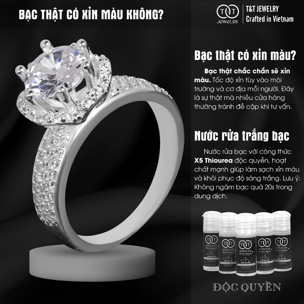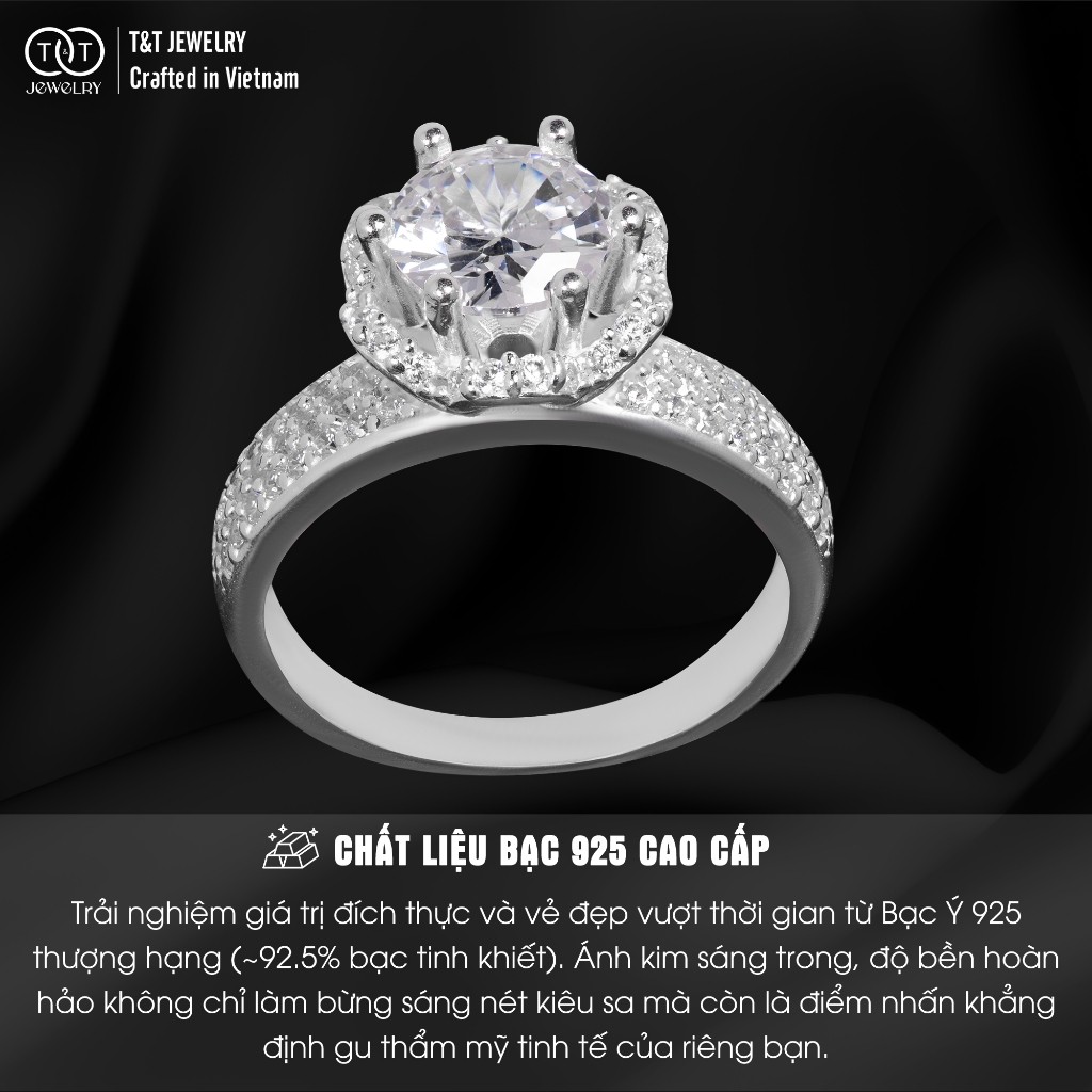 ✨ T&T JEWELRY tin rằng, mỗi người phụ nữ đều mang trong mình cốt cách nữ hoàng, và xứng đáng sở hữu một chiếc nhẫn quyền quý, lộng lẫy tựa vương miện.💍 Nếu bạn đang tìm kiếm một tuyệt tác trang sức thực sự đẳng cấp, thu hút mọi ánh nhìn và khiến bạn cảm thấy thật đặc biệt, chiếc nhẫn bạc nữ S925 này chính là câu trả lời.👑 Tâm điểm là viên đá chủ CZ tròn lớn, cắt giác hoàn mỹ, ngự trị kiêu hãnh trên một bệ đỡ được thiết kế cầu kỳ tựa chiếc vương miện hoàng gia. Bệ đỡ này được tích hợp một vòng Halo ✨ gồm những viên đá tấm CZ nhỏ xinh, bao quanh chân đá chủ, không chỉ tăng độ bắt sáng mà còn tạo nên vẻ quyền quý, xa hoa độc đáo. Vẻ lộng lẫy được đẩy lên đỉnh điểm với phần đai nhẫn dày dặn, đính kết hai hàng đá tấm Pavé lấp lánh, tạo hiệu ứng thị giác choáng ngợp.💖 Sự kết hợp hoàn hảo giữa đá chủ rực rỡ, bệ đỡ vương miện tinh xảo và đai nhẫn pavé kép xa hoa tạo nên một kiệt tác thực sự. Chế tác từ bạc S925 cao cấp bởi nghệ nhân Châu Khê 500 năm kinh nghiệm của T&T, chiếc nhẫn này là biểu tượng của quyền lực, sự sang trọng và vẻ đẹp vĩnh cửu.⚠️ T&T JEWELRY – Bảo Chứng Cho Đẳng Cấp Thật: Hãy là người tiêu dùng thông thái! Chúng tôi cam kết bạc S925 chuẩn và thiết kế độc quyền. T&T không chịu trách nhiệm về chất lượng bạc hay độ tinh xảo của các sản phẩm nhái mẫu mã. Chọn T&T để sở hữu kiệt tác đích thực!💎 THÔNG TIN SẢN PHẨM 💎Chất liệu: Bạc S925 Ý cao cấp (92.5% bạc + hợp kim tăng độ cứng, bền), 100% chế tác bởi nghệ nhân Châu Khê. Đá Cubic Zirconia (CZ) cao cấp.Xuất xứ: Việt Nam – Thương hiệu T&T JEWELRY (Làng nghề Châu Khê).Bạc xỉn màu? Là dấu hiệu bạc THẬT! Do phản ứng tự nhiên với môi trường. Chỉ 5 giây với nước rửa bạc T&T độc quyền, nhẫn lại sáng bóng như mới.Ảnh sản phẩm: T&T JEWELRY tự chụp 100%. Màu sắc có thể chênh lệch rất nhẹ (dưới 5%) do ánh sáng/thiết bị xem.✨ T&T JEWELRY – AN TÂM MUA SẮM ONLINE ✨💯 Cam kết: Đền 10 lần nếu phát hiện bạc giả. Bảo hành làm sáng MIỄN PHÍ trọn đời. Đổi trả 7 ngày nếu lỗi sản xuất.🛠️ Hỗ trợ An Toàn & DUY NHẤT: Qua Shopee Chat. Minh bạch, đúng chính sách Shopee, bảo vệ bạn khỏi rủi ro từ kênh ngoài sàn.🎁 Quà tặng: Đi kèm hộp đựng trang sức T&T cao cấp.💡 GIỮ NHẪN LUÔN ĐẸP QUYỀN QUÝ 💡Tránh tiếp xúc hóa chất mạnh, mỹ phẩm.Nên tháo khi làm việc nặng, vận động, bơi lội.Lau nhẹ bằng khăn mềm chuyên dụng sau khi dùng.Bảo quản trong hộp/túi zip kín khi không sử dụng.Làm sáng bằng dung dịch rửa bạc T&T khi cần.