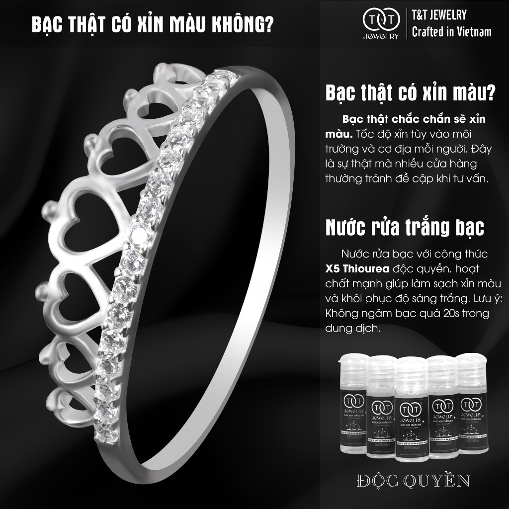 👑 Mỗi cô gái đều là một nàng công chúa. Và đây là chiếc vương miện dành riêng cho bạn!💍 T&T Jewelry tin rằng, bạn không cần một chàng hoàng tử để cảm thấy đặc biệt. Chiếc nhẫn bạc Vương Miện Trái Tim này được sinh ra để tự bạn trao cho mình ngôi vị nữ hoàng của cuộc đời mình.💖 Thiết kế là sự đan kết của những trái tim yêu thương, tạo nên một chiếc vương miện nhỏ xinh trên ngón tay. Dải đá CZ cao cấp được đính kết tỉ mỉ, lấp lánh như những vì sao, tôn lên vẻ đẹp kiêu sa, trong trẻo và làm sáng bừng đôi tay bạn.💎 Đây không chỉ là một chiếc nhẫn, mà là một lời khẳng định về vẻ đẹp và giá trị của riêng bạn.✨ THÔNG TIN SẢN PHẨM ✨Chất liệu: Bạc Ý S925 cao cấp (gồm 92.5% bạc nguyên chất, còn lại là hợp kim để tăng độ cứng, độ bền và độ sáng bóng cho sản phẩm). Đây là tiêu chuẩn quốc tế cho trang sức bạc, giúp nhẫn giữ form hoàn hảo.Chế tác: 100% thủ công bởi nghệ nhân làng nghề kim hoàn Châu Khê với 500 năm lịch sử, độc quyền cho T&T JEWELRY.Đá: Đá Cubic Zirconia (CZ) cao cấp, trong suốt với giác cắt hoàn hảo, tạo hiệu ứng lấp lánh rực rỡ.Cảnh báo: Mọi sản phẩm có thiết kế tương tự trên thị trường không do T&T JEWELRY sản xuất sẽ không được chúng tôi đảm bảo về hàm lượng bạc cũng như độ tinh xảo trong chế tác.Lưu ý ảnh: Hình ảnh do T&T JEWELRY tự thực hiện, màu sắc sản phẩm bên ngoài có thể chênh lệch không đáng kể (tối đa 5%) do điều kiện ánh sáng khác nhau.✨ T&T JEWELRY – BẢO HÀNH & HỖ TRỢ KHÁCH HÀNG ✨💖 Cảm ơn bạn đã chọn T&T Jewelry!Trang sức không chỉ là một món phụ kiện, mà còn là cách bạn thể hiện phong cách và cá tính. Khi mua trang sức online, chúng tôi hiểu rằng bạn có thể có những băn khoăn như:1️⃣ “Liệu sản phẩm có giống ảnh không?”2️⃣ “Có phải bạc thật không?”3️⃣ “Nếu có vấn đề thì làm sao?”💯 T&T Jewelry x Shopee Mall cam kết mang đến bạc 925 cao cấp cùng sự hỗ trợ tận tâm, giúp bạn hoàn toàn yên tâm khi mua sắm:1️⃣ Hoàn tiền nhanh chóng trong 7 ngày nếu sản phẩm không đúng mô tả hoặc có lỗi từ nhà sản xuất.2️⃣ T&T cam kết đền gấp 10 lần giá trị nếu sản phẩm khách hàng nhận được là bạc giả – và chúng tôi chịu hoàn toàn trách nhiệm trước pháp luật Việt Nam.3️⃣ Bảo hành trọn đời với lỗi kỹ thuật do nhà sản xuất – chỉ cần nhắn Shopee Chat, chúng tôi sẽ hỗ trợ ngay!⛔ Hỗ trợ nhanh chóng và duy nhất qua Shopee Chat – đảm bảo giao dịch an toàn, MINH BẠCH, tuân thủ quy định của Shopee và giúp bạn tránh mọi rủi ro từ các kênh không chính thống. Không hỗ trợ qua các kênh liên lạc ngoại sàn để bảo vệ quyền lợi của bạn. Nếu có bất kỳ vấn đề gì, đừng lo lắng! Nhắn ngay cho chúng tôi qua Shopee Chat, đội ngũ T&T Jewelry sẽ hỗ trợ tận tình!❓ SỰ THẬT VỀ BẠC 925 – HIỂU ĐỂ AN TÂM1️⃣ Trang sức của T&T Jewelry có phải bạc thật không?✔ Cam kết 100% bạc 925 cao cấp, chứa 92,5% bạc nguyên chất, đạt tiêu chuẩn quốc tế.📌 Tại sao không phải bạc nguyên chất 100%?Bạc nguyên chất quá mềm, dễ bị móp méo, vì vậy cần pha một lượng nhỏ hợp kim giúp trang sức bền hơn, cứng hơn, giữ form tốt hơn. Đây là tiêu chuẩn chung của ngành kim hoàn.2️⃣ Tại sao bạc bị xỉn màu? Có phải hàng kém chất lượng không?🌟 Hoàn toàn không! Đây chính là dấu hiệu của bạc thật! 🌟🔬 Nguyên nhân bạc bị xỉn: Bạc phản ứng với lưu huỳnh trong không khí, nước hoa, mồ hôi, hóa mỹ phẩm… Một số người có cơ địa đặc biệt khiến bạc xỉn màu nhanh hơn. Đây là tính chất tự nhiên của bạc, không phải lỗi sản phẩm.💡 Giải pháp cực đơn giản: Dùng nước rửa bạc công thức độc quyền của T&T, trang sức sẽ sáng trắng trở lại trong 5 giây!3️⃣ Tại sao lại có những loại bạc tôi thấy không bị xỉn màu?Thực tế, những sản phẩm này thường được xi mạ một lớp kim loại khác bên ngoài. Lớp xi này sẽ mòn dần theo thời gian và bạc bên trong vẫn sẽ bị xỉn màu nếu không được chăm sóc.🌟 HƯỚNG DẪN SỬ DỤNG ĐỂ TRANG SỨC BẠC LUÔN SÁNG BÓNG1️⃣ Lau chùi nhẹ nhàng: Dùng khăn mềm lau sạch sau mỗi lần đeo.2️⃣ Hạn chế tiếp xúc hóa chất: Đeo trang sức sau khi trang điểm và tháo ra khi làm việc nhà.3️⃣ Cất giữ cẩn thận: Bảo quản trong hộp kín hoặc túi zip khi không dùng.4️⃣ Làm sạch định kỳ: Dùng nước rửa bạc chuyên dụng của shop khi thấy bạc có dấu hiệu xỉn màu.5️⃣ Tháo trang sức khi vận động: Tránh va đập, trầy xước.💖 Bạn Hài Lòng – T&T Hạnh Phúc: Một đánh giá 5 sao sẽ là động lực rất lớn để chúng tôi tiếp tục phục vụ bạn tốt hơn ở đơn hàng tiếp theo!TỪ KHÓA VÀ HASHTAGnhẫn bạc nữ, nhẫn bạc 925, nhẫn nữ đẹp, nhẫn vương miện, nhẫn trái tim, nhẫn bạc s925 nữ, nhẫn nữ t&t jewelry, trang sức bạc, phụ kiện thời trang, nhẫn nữ hàn quốc, nhẫn bạc nữ cá tính, nhẫn công chúa, nhẫn bạc ý#nhanbacnu #nhanbac925 #nhannudep 